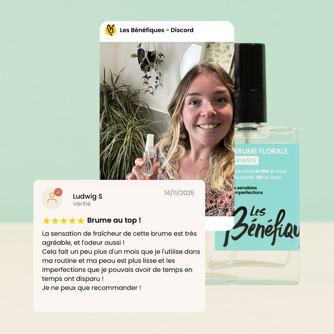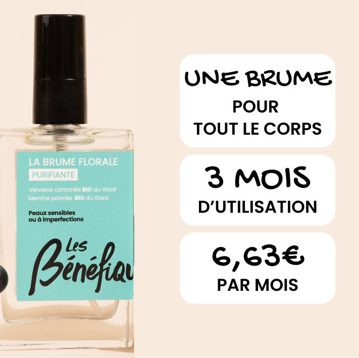Pour notre Brume Florale Purifiante, nous avons sélectionné avec soin des eaux florales biologiques auprès d’un producteur français éco-responsable, qui veille à préserver la pureté de ses plantes.