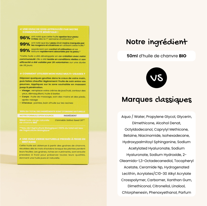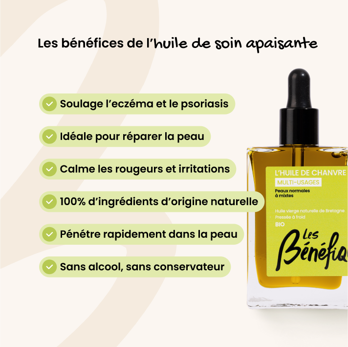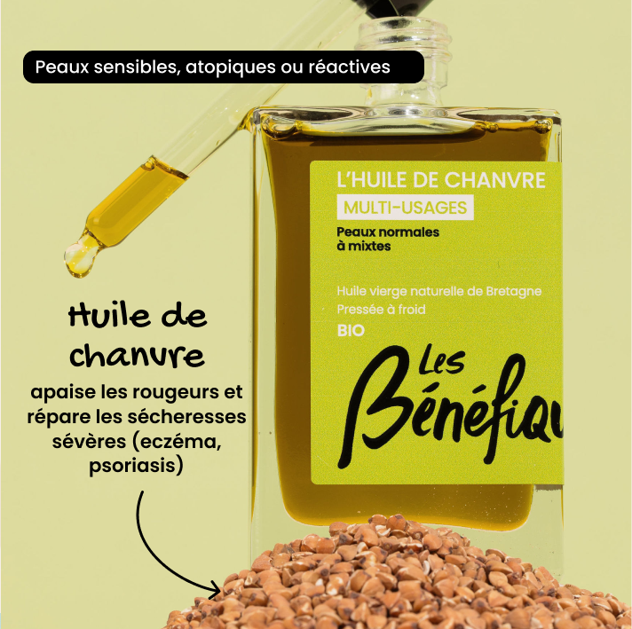 Découvrez l'huile de soin idéale pour les peaux sensibles ou réactives : l'huile de chanvre 100% française calme les rougeurs et les irritations en quelques instants.
