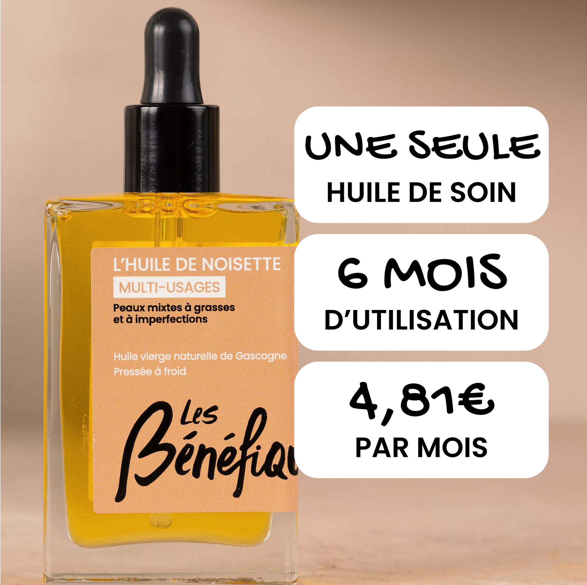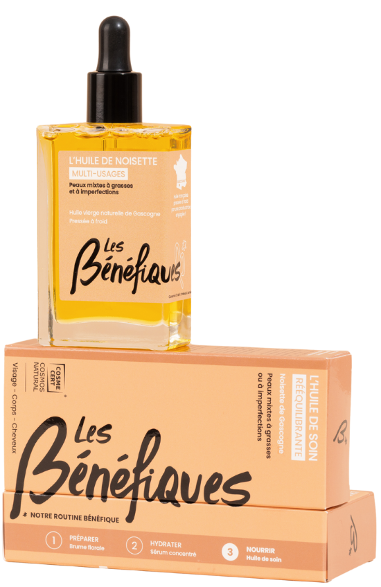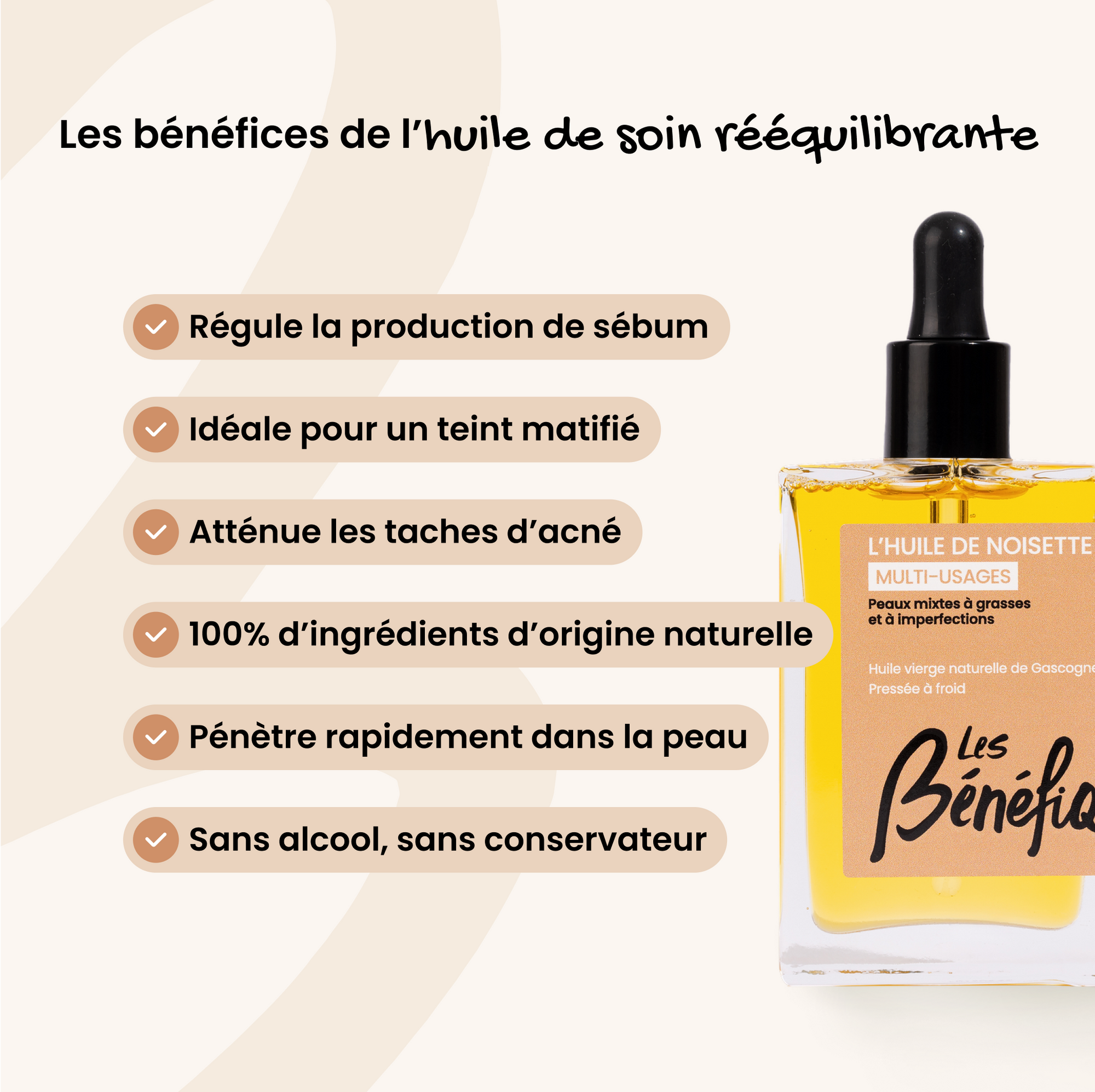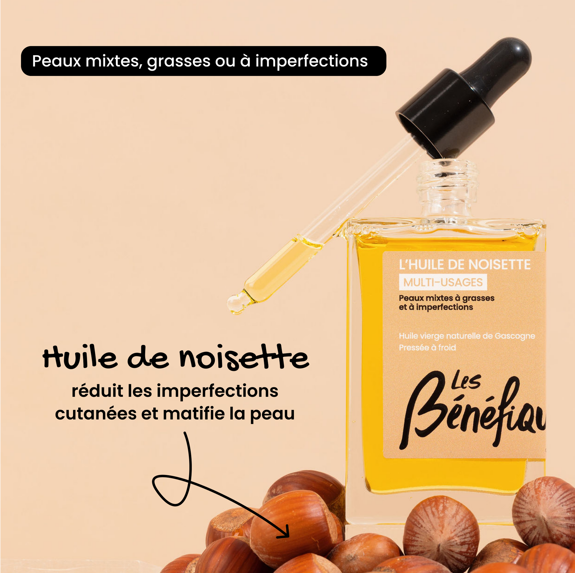 Découvrez l'huile de soin idéale pour les peaux mixtes, grasses ou à imperfections : l'huile de noisette toastée 100% française nourrit et équilibre naturellement la production de sébum.