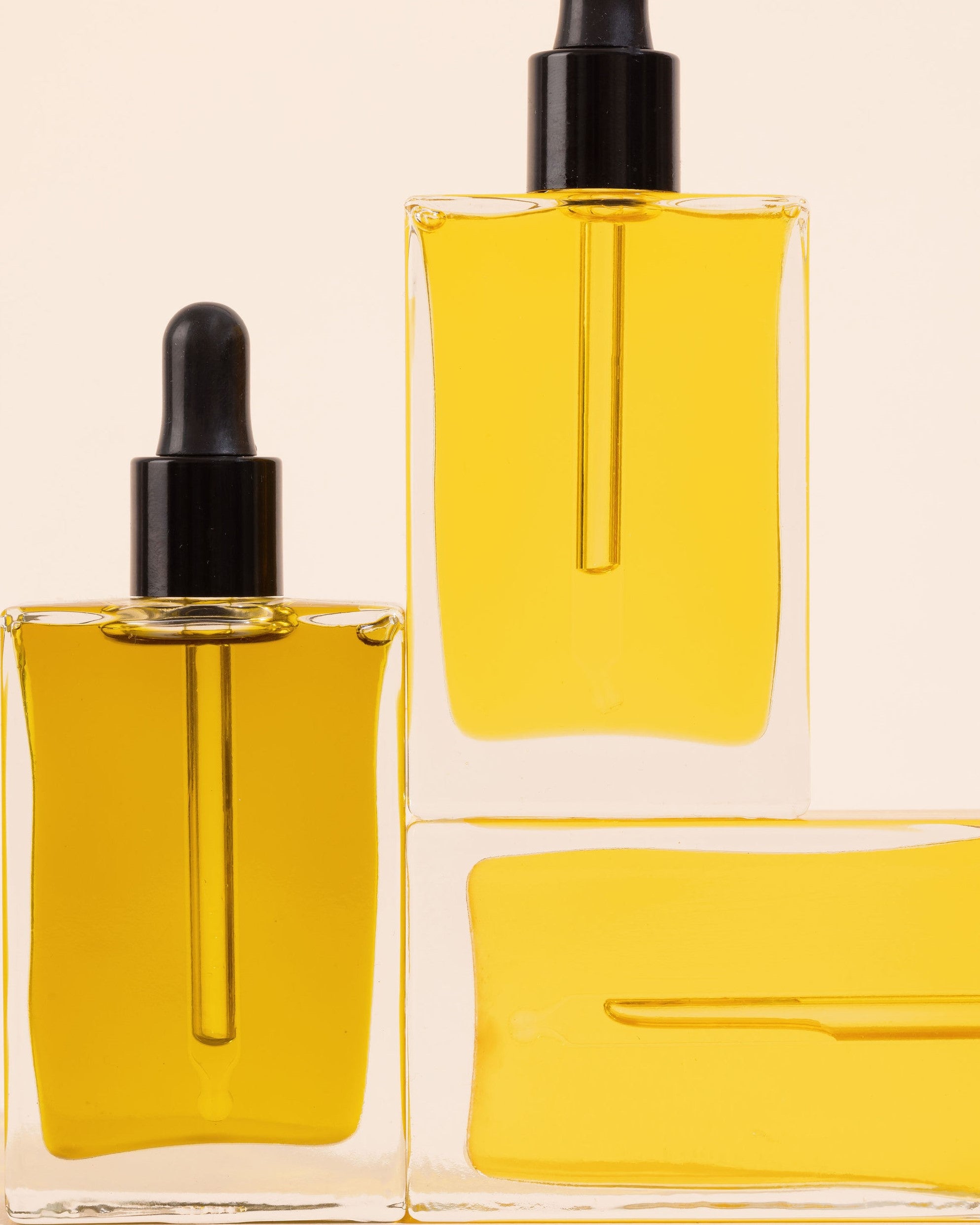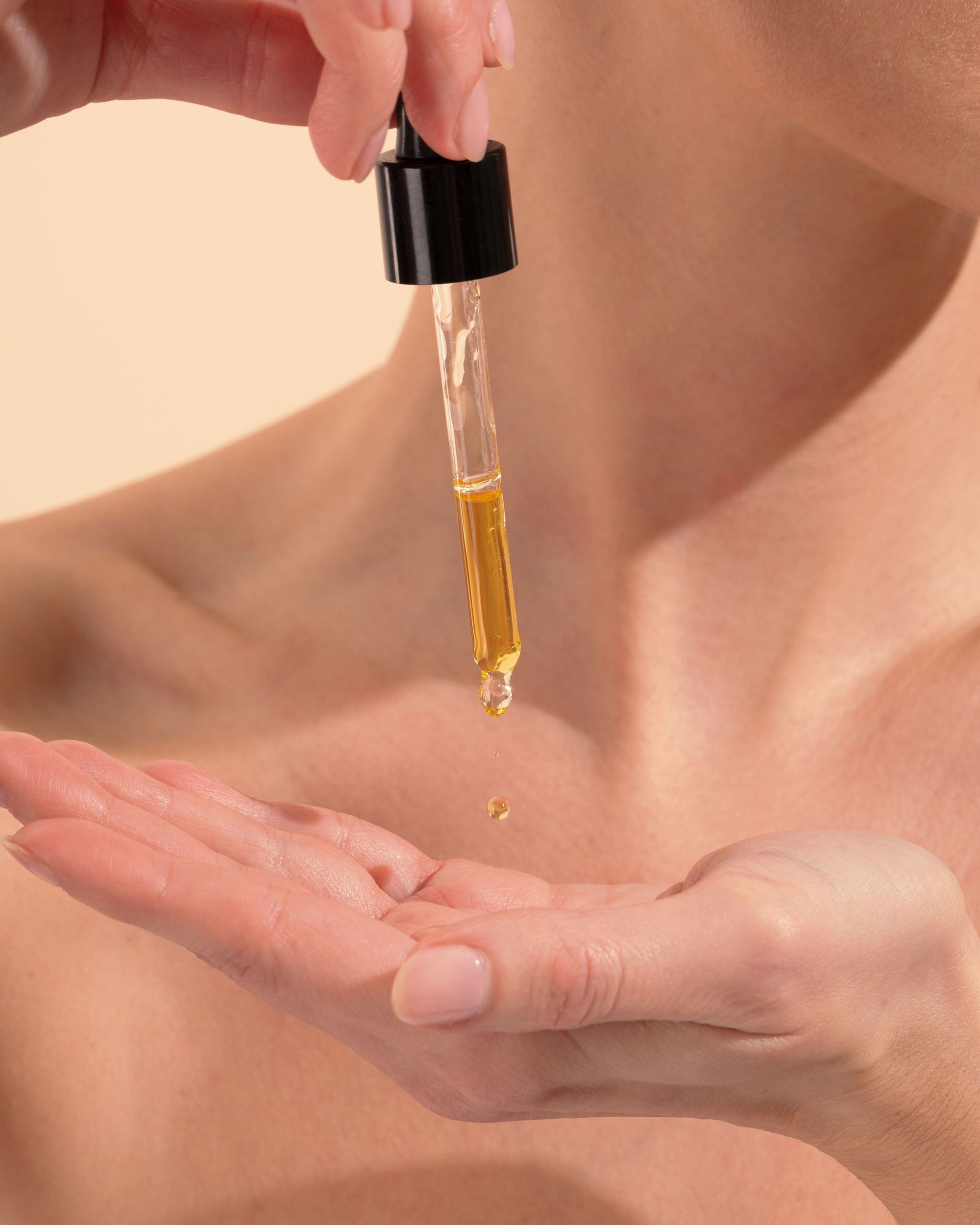 Étape 1 : A l'aide du compte-goutte, déposez 3 à 4 gouttes d'huile dans le creux de votre main.