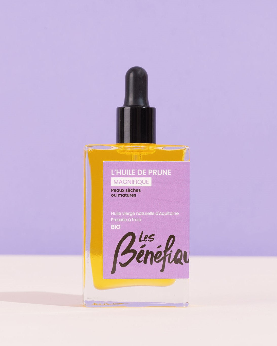 Nous avons sélectionné notre huile de prune avec soin auprès d’une productrice située en Aquitaine. Engagée dans une démarche d’upcycling, elle valorise les noyaux des pruneaux d’Agen dont elle récupère et presse à froid les amandons pour obtenir une huile de prune vierge, éco-responsable et française.
