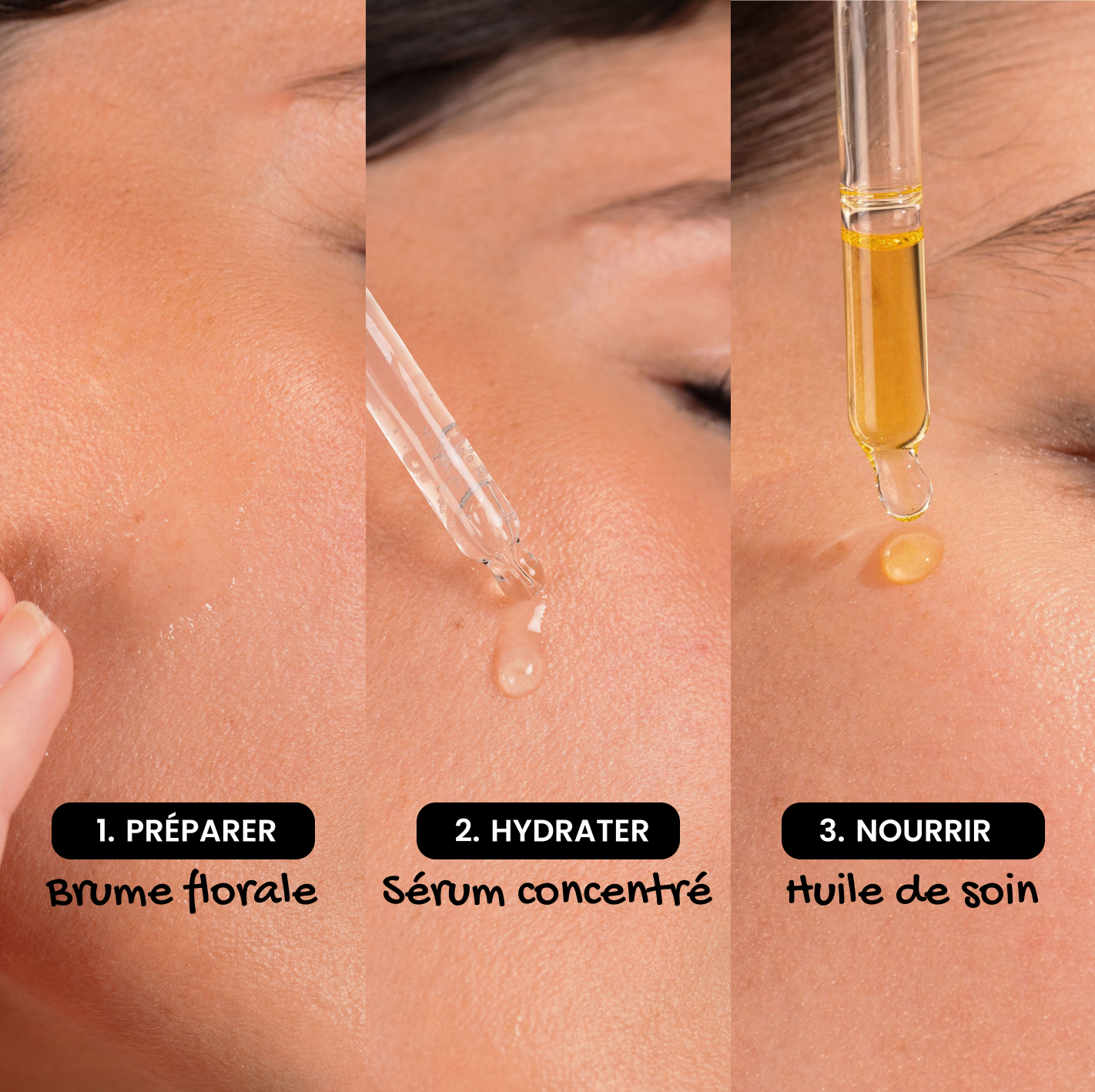 Notre routine est efficace parce qu’elle respecte le fonctionnement naturel de la peau : plutôt que de tout mélanger dans une seule formule, nous séparons l’hydratation et la nutrition pour permettre à chaque actif d’agir pleinement, sans interférences ni additifs inutiles. Résultat : une peau mieux hydratée, mieux nourrie, et visiblement plus saine.