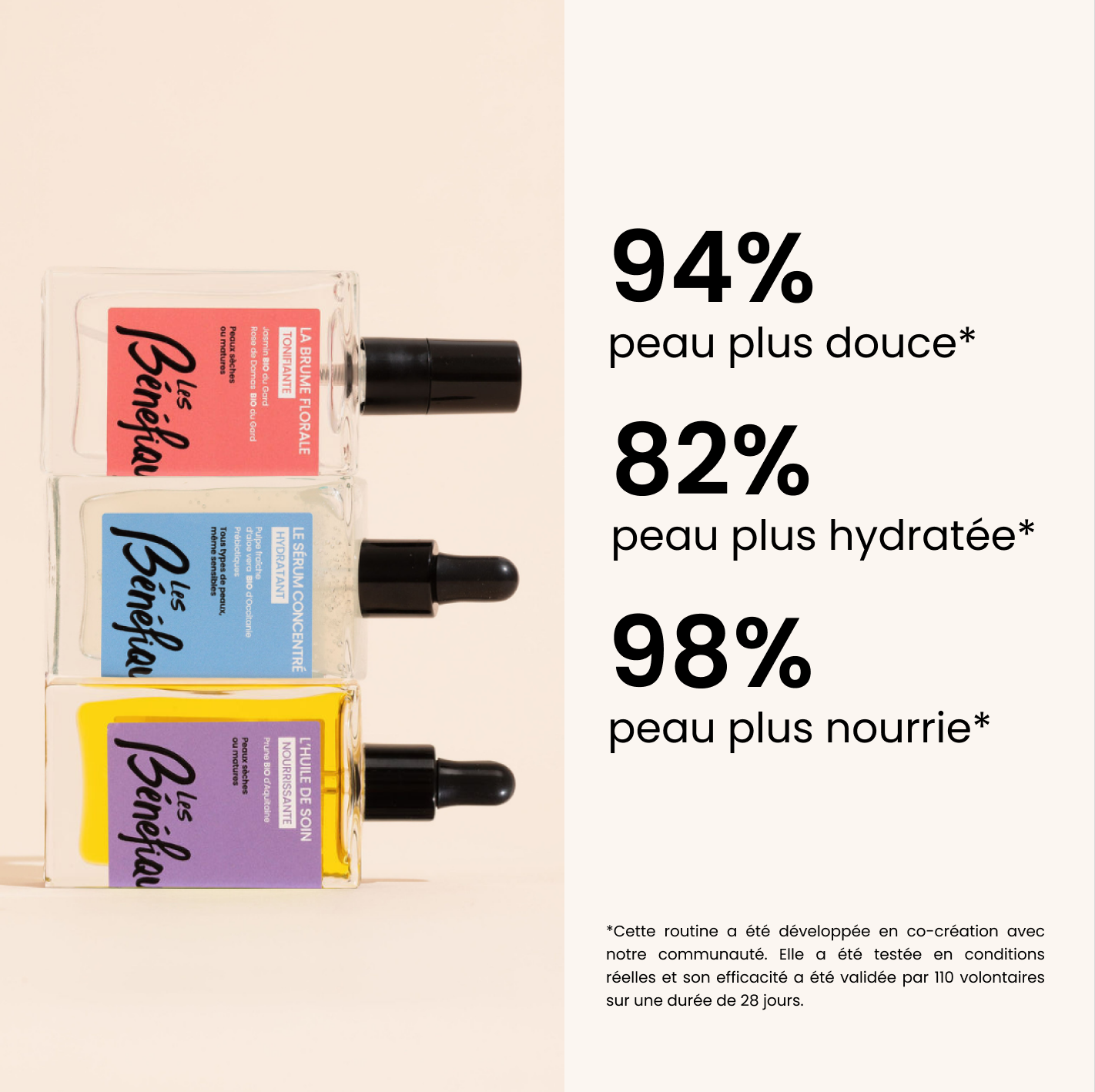 Cette routine de soin est le résultat d'un processus de co-création avec plus de 100 testeurs après 1 mois d'utilisation en conditions réelles. Chaque retour a été pris en compte, c'est un choix essentiel pour garantir l'efficacité de nos produits.